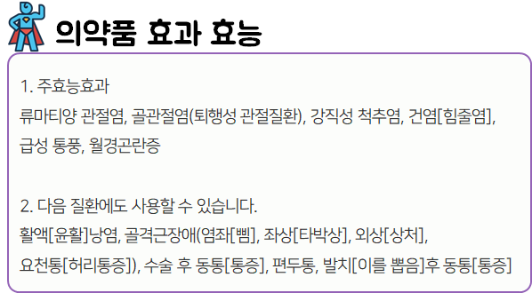 이 의약품은 '염증을 완화시키고, 통증을 해소하는 약으로 관절염, 편두통, 생리통, 치통 증상 완화에 사용되는 약'이니 참고하시길 바랍니다.