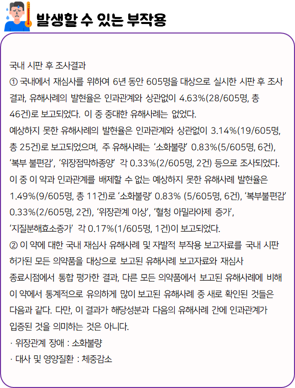 또한 복용 중 부작용 등의 이상반응이 나타날 시 즉시 복용을 멈추고, 전문가 or 의사와 상담하신 후 복용량을 줄이거나 복용을 멈추시는 것이 좋습니다.