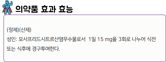 : 성인 : 모사프리드시트르산염무수물로서 1일 15 mg을 3회로 나누어 식전 또는 식후에 경구투여합니다.
