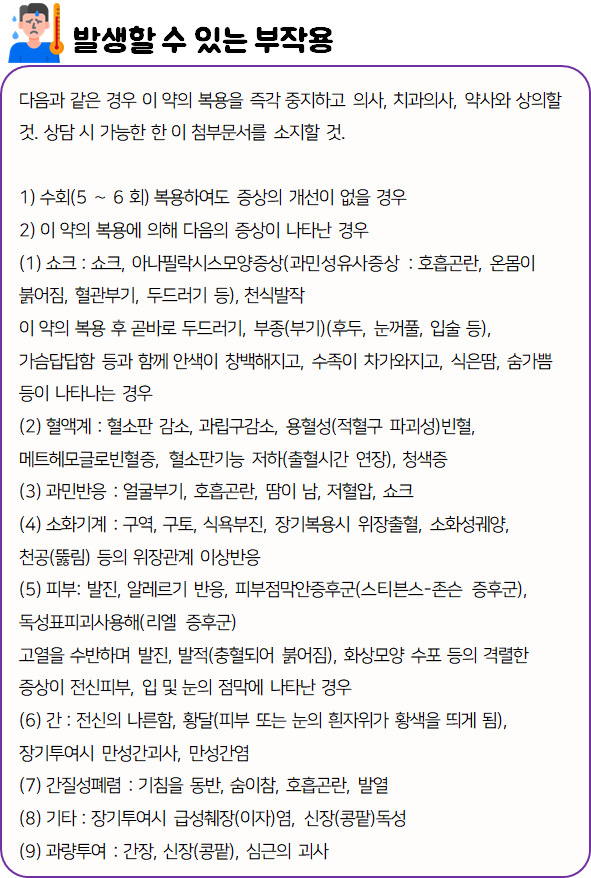 의약품은 반드시 복용 전에 복용 시 발생할 수 있는 부작용이나 주의사항 등을 미리 확인하신 후 드셔야 안전하게 먹을 수 있습니다.