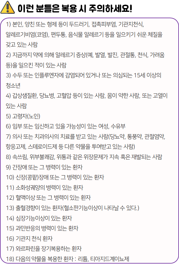 - 다음과 같은 사람은 복용 시 위험할 수 있으므로 복용하지 마시길 바랍니다.