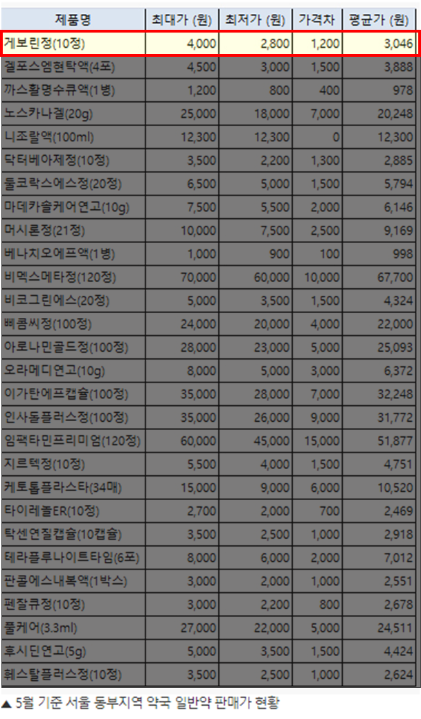 게보린은 전국 약국에서 구매가 가능한데, 2020년 5월 기준 최대가 4,000원 최저가 2,800원으로 1,200원 정도의 차이를 보였습니다.