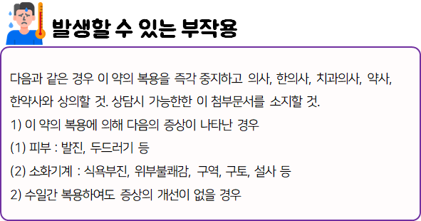 또한 복용 중 부작용 등의 이상반응이 나타날 시 즉시 복용을 멈추고, 전문가 or 의사와 상담하신 후에 복용 지속 여부를 결정하시는 것이 좋습니다.