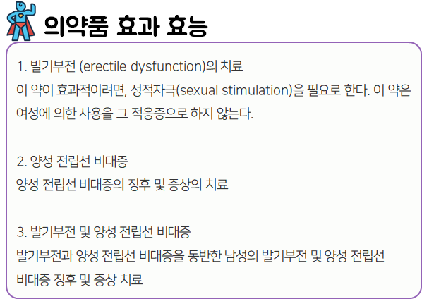 이 의약품은 평활근을 이완시켜 발기를 촉진시키고 전립선 비대증을 치료하는 약이니 참고하시길 바랍니다.