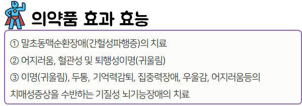 이 의약품은 혈관보호 및 혈관확장 작용을 통해 혈액순환을 촉진하고, 뇌기능을 개선시켜주는 약이니 참고하시길 바랍니다.