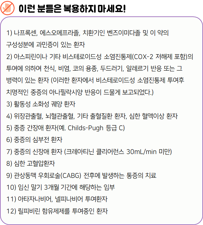 비스테로이드성 소염진통제(나프록센 등)와 관련한 위궤양 및/또는 십이지장궤양의 발생 위험이 있으면서 저용량 나프록센 또는 다른 비스테로이드성 소염진통제에 의해 충분하지 않은 환자에서의 골관절염, 류마티스성 관절염, 강직성척추염의 증상 치료에 사용되는 의약품