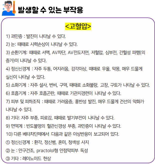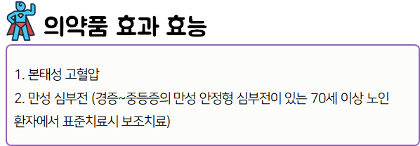 이 의약품은 심박동수를 감소시키고 혈관확장효과가 있어 혈압을 낮추고 심장부담을 감소시키는 약이니 참고하시길 바랍니다.