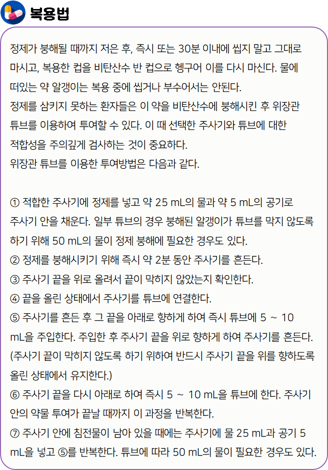 약을 삼키기 어려운 환자들은 이 약을 비탄산수 반 컵에 붕해시켜 복용하셔도 됩니다.