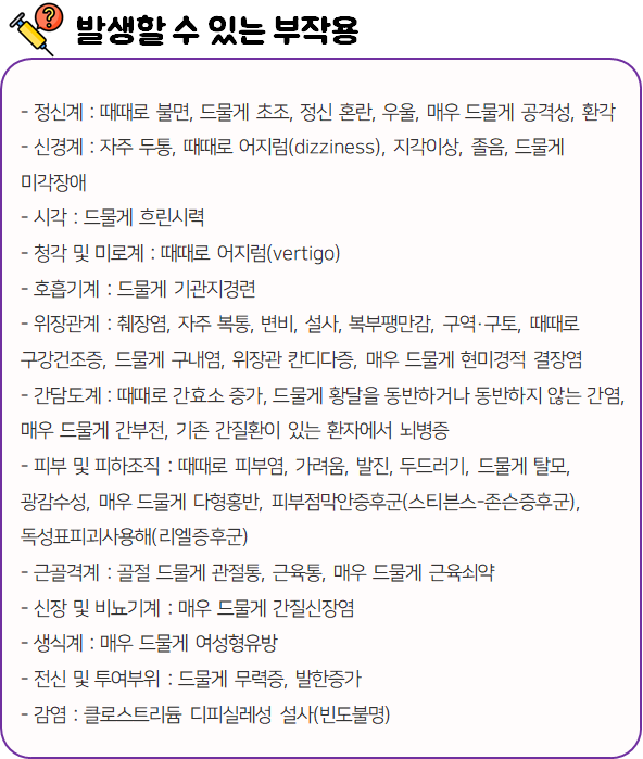 몸에 맞지 않는 의약품의 경우 크고 작은 이상 반응을 불러 일으킬 수 있으므로 드시기 전에 반드시 부작용이나 주의사항 등을 미리 확인하시길 바랍니다.