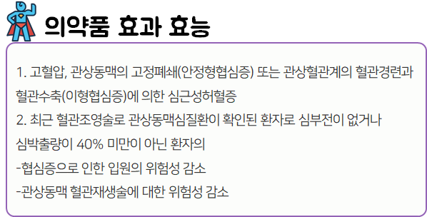이 의약품은 혈관확장 작용으로 혈압을 낮추고, 심장 부담을 감소시키며 심장으로의 산소공급을 늘려 주는 약이니 참고하시길 바랍니다.