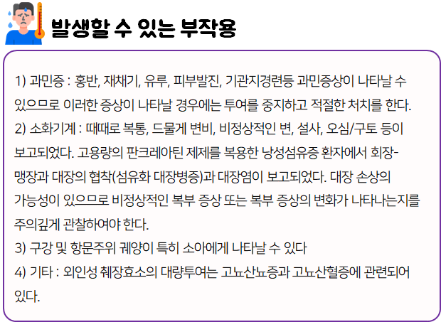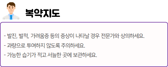 또한 복용 중 부작용 등의 이상반응이 나타날 시 즉시 복용을 멈추고, 전문가 or 의사와 상담하신 후에 복용 지속 여부를 결정하시는 것이 좋습니다.
