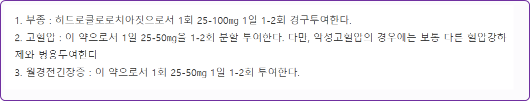 이 의약품은 부종 / 고혈압 / 월경전긴장증 등 각 질병에 따라서 복용 방법이 조금씩 상이합니다.