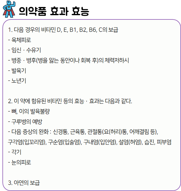 이 의약품은 '원활한 대사기능에 필요한 각종 영양분을 공급하는 비타민'이니 참고하시길 바랍니다.