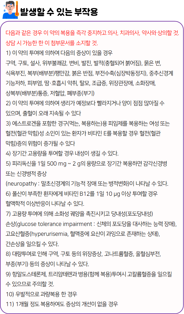 몸에 맞지 않는 의약품의 경우 크고 작은 이상 반응을 불러일으킬 수 있으므로 드시기 전에 반드시 부작용이나 주의사항 등을 미리 확인하시길 바랍니다.
