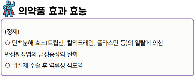 이 의약품은 단백분해효소 억제제로 만성 췌장염, 위절제 수술후 역류성 식도염에 사용되는 약인데요, 코로나 치료제로 최근 개발되고 있는 의약품이 아닌 2012년 국내 식약처에서 허가받고 쭉 쓰여왔던 약이라 안전성 문제에서 타 약품에 비해 검증됐다고 볼 수 있습니다.