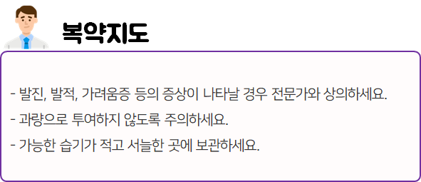또한 혹시나 복용 중 부작용 등의 이상반응이 나타날 시 즉시 복용을 멈추고, 전문가 or 의사와 상담하신 후에 복용 지속 여부를 결정하시는 것이 좋습니다.