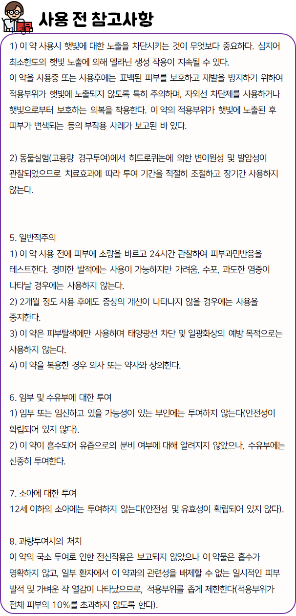 이 의약품은 '멜라닌 색소의 생성을 억제하며, 색소침착부위에서 미백작용을 나타내는 약'이니 참고하시길 바랍니다.