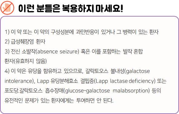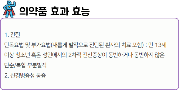 이 의약품은 "과도하게 흥분한 신경막을 안정시킴으로써 경련의 빈도를 감소시키고, 신경통을 개선하는 약"이니 참고하시길 바랍니다.