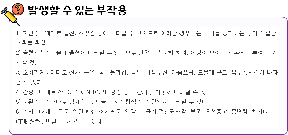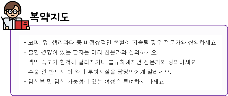2) 항혈소판제, 혈전용해제, 항응혈제를 투여중인 환자는 복용 전 의사와 반드시 상의하시길 바랍니다.