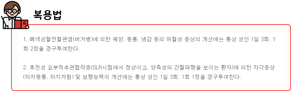 이 의약품은 혈관확장 작용과 혈소판 응집을 억제하여 말초순환장애를 개선하는 약이니 참고하시길 바랍니다.