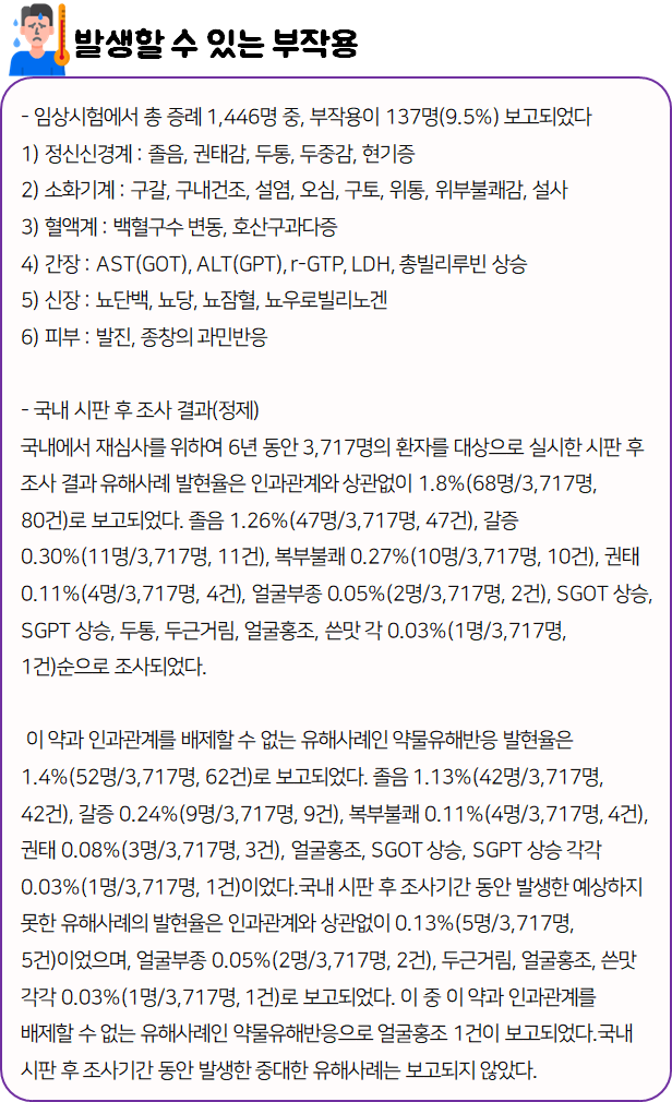 또한 혹시나 복용 중 부작용 등의 이상반응이 나타날 시 즉시 복용을 멈추고, 전문가 or 의사와 상담하신 후에 복용 지속 여부를 결정하시는 것이 좋습니다.