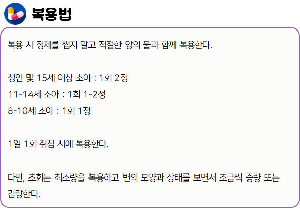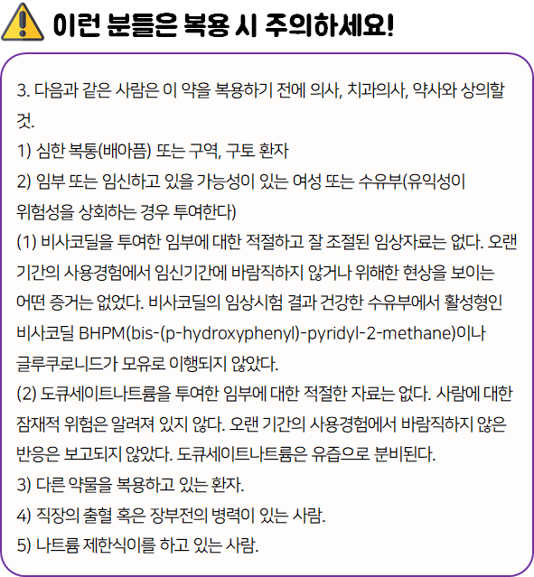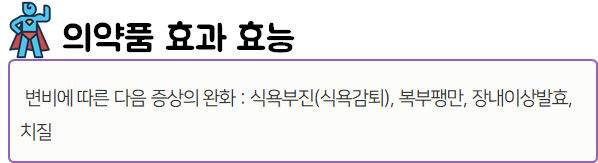 이 의약품은 장점막을 자극하여 연동운동을 촉진시킴으로써 변의 이동성을 증가시키는 변비약이니 참고하시길 바랍니다.