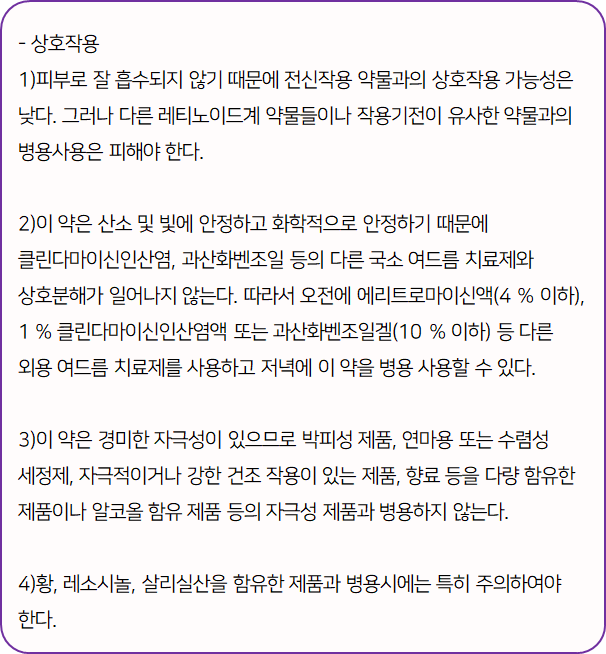 이 의약품은 '피부 각질층을 얇게하고 피지선의 활성을 억제하여 여드름을 치료하는 약'이니 참고하시길 바랍니다.