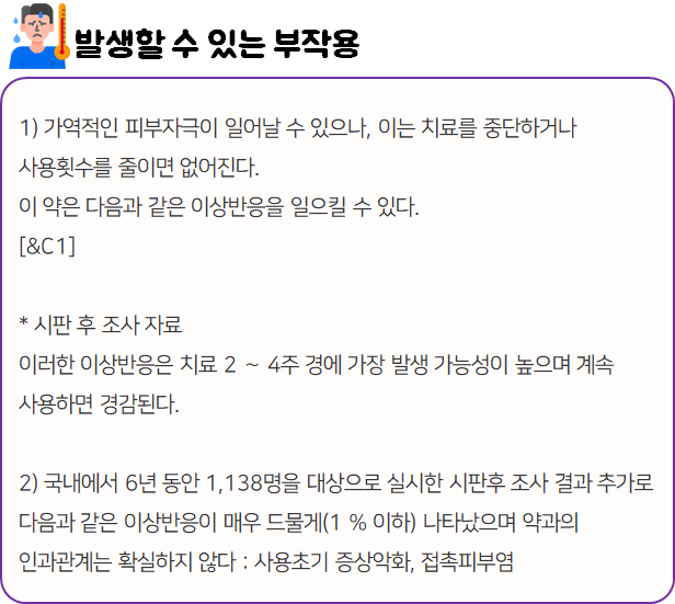 디페린겔을(를) 사용할 시 다음과 같은 부작용이 발생할 수 있으니 주의하시길 바랍니다.