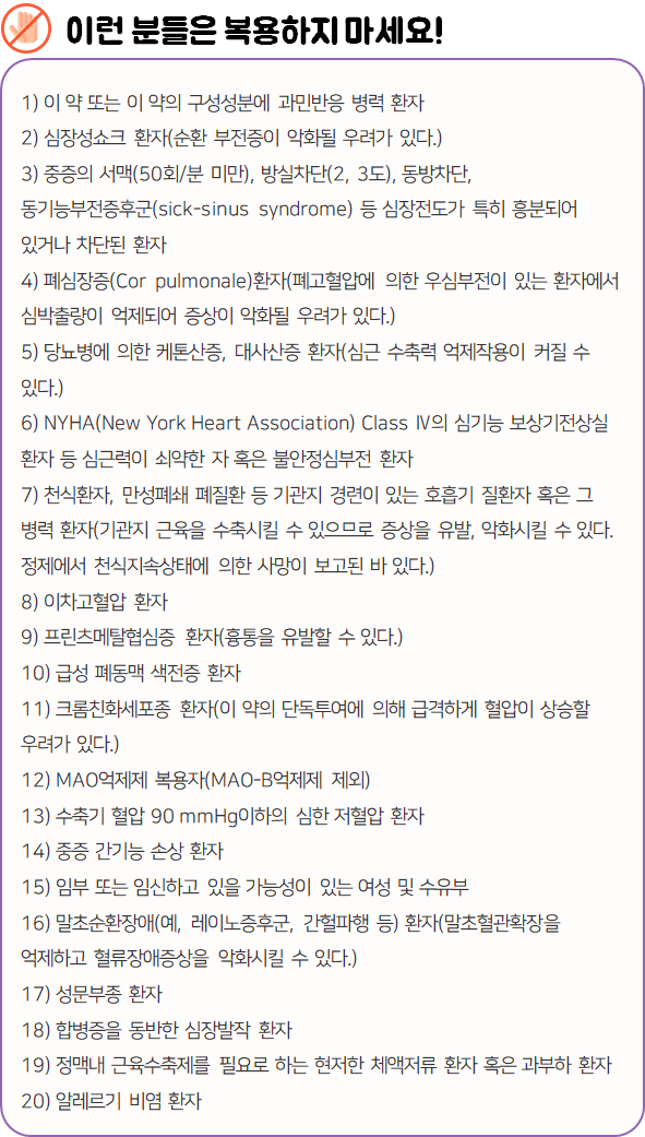 이 의약품은 심박동수를 감소시키고 혈관확장효과가 있어 혈압을 낮추고 심장부담을 감소시키는 약이니 참고하시길 바랍니다.