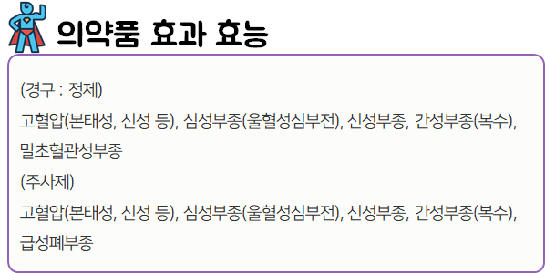이 의약품은 신장에서 나트륨 및 수분의 재흡수를 억제하여 혈압을 감소시키고 부종을 치료하는 약이니 참고하시길 바랍니다.