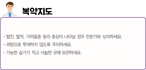 또한 복용 중 부작용 등의 이상반응이 나타날 시 즉시 복용을 멈추고, 전문가 or 의사와 상담하신 후에 복용 지속 여부를 결정 하시는 것이 좋습니다.