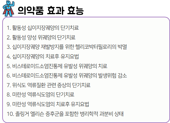 이 의약품은 위산 분비를 감소시킴으로써 위산분비 과다로 인한 각종 소화기 증상을 개선하는 약이니 참고하시길 바랍니다.