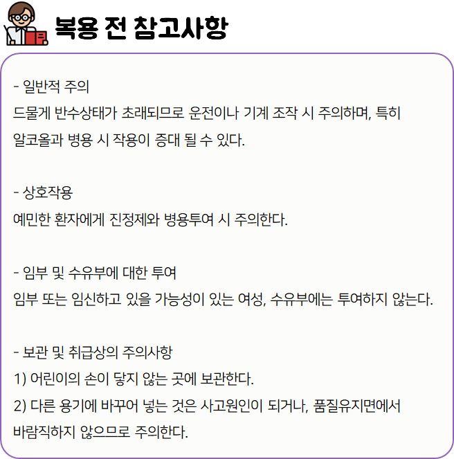 몸에 맞지 않는 의약품의 경우 크고 작은 이상 반응을 불러 일으킬 수 있으므로 드시기 전에 반드시 부작용이나 주의사항 등을 미리 확인하시기 바랍니다.