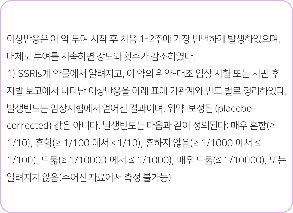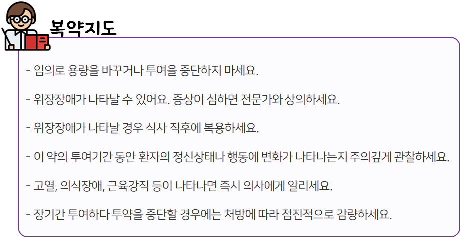 이 의약품은 체내 신경전달 물질의 양을 조절함으로써 항우울 등의 효과를 나타내는 약이니 참고하시길 바랍니다.