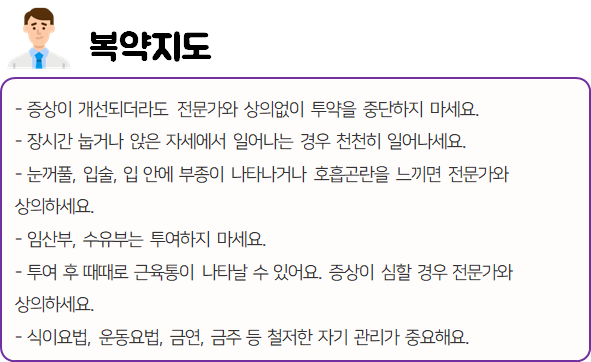 또한 복용 중 부작용 등의 이상반응이 나타날 시 즉시 복용을 멈추고, 전문가 or 의사와 상담하신 후에 복용 지속 여부를 결정하시는 것이 좋습니다.