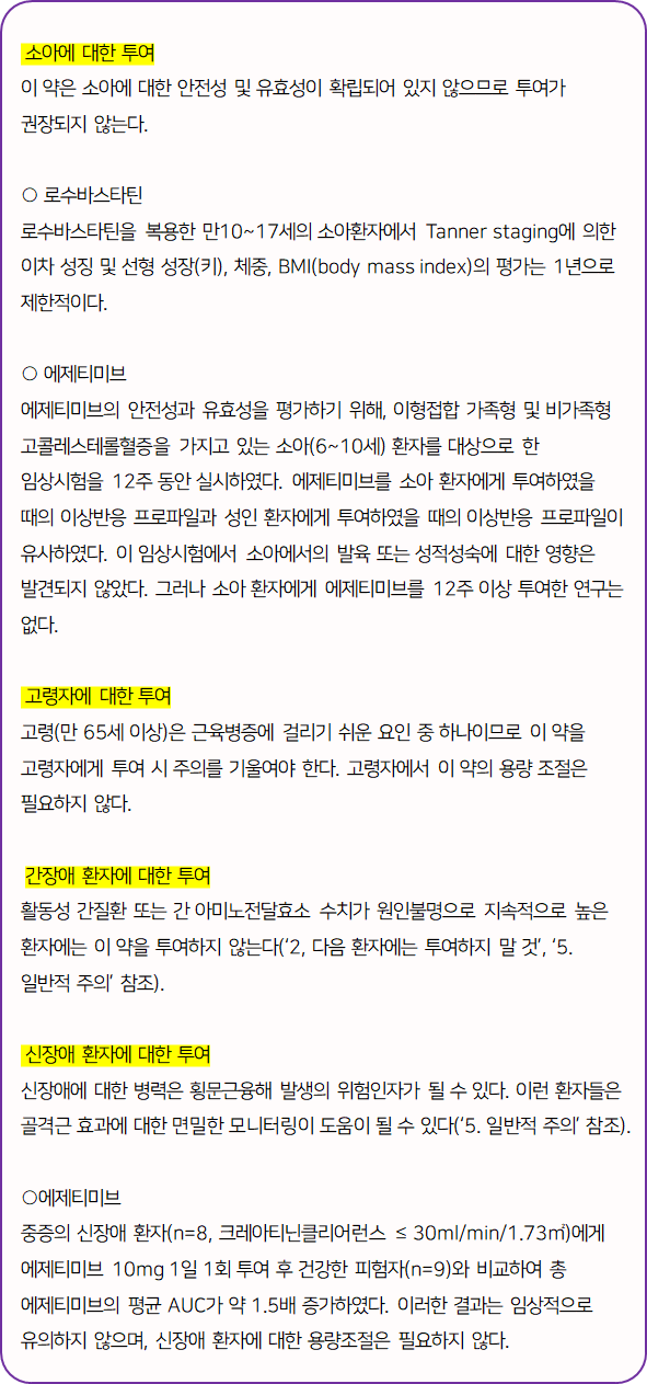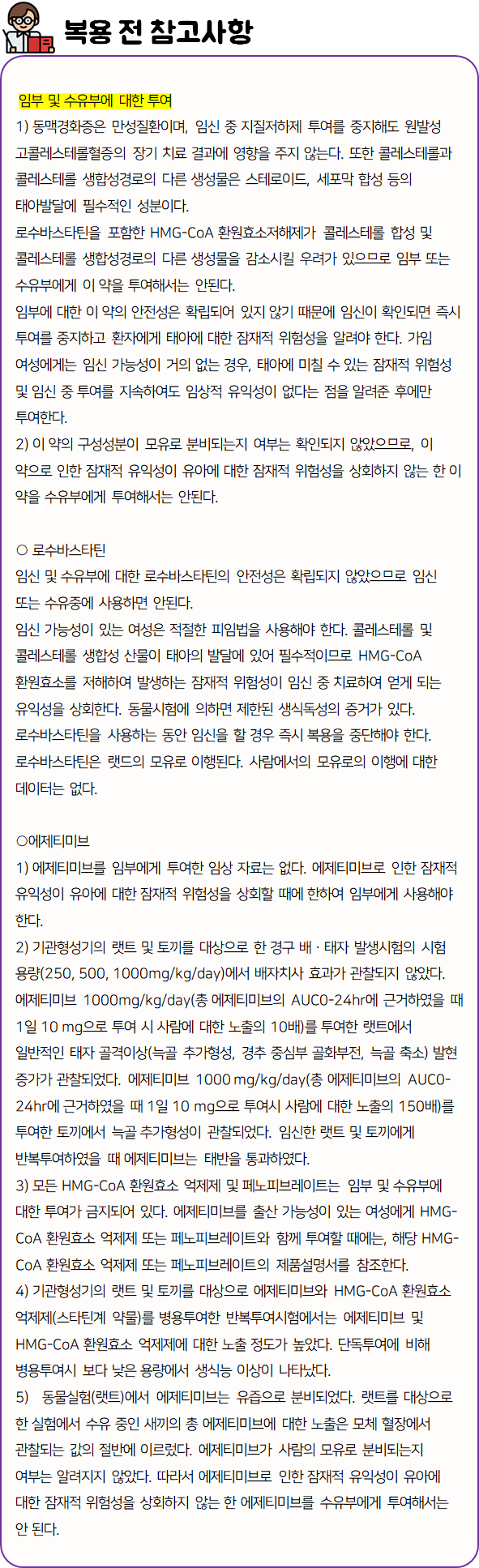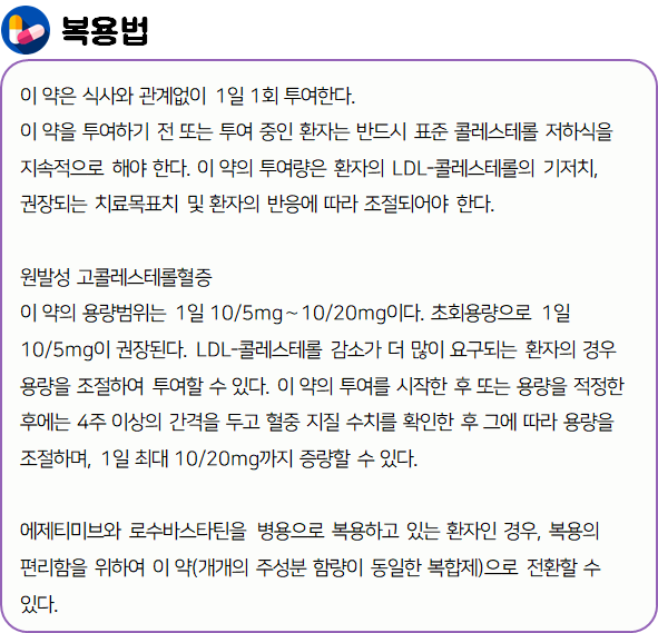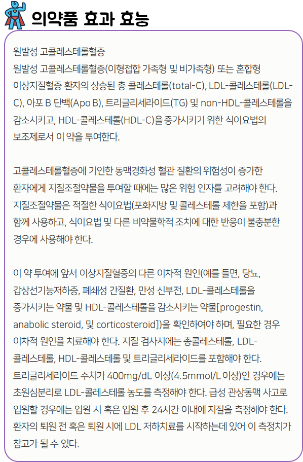 이 의약품은 '콜레스테롤의 합성 및 소장에서의 흡수를 저해하여 혈중 콜레스테롤 농도를 감소시키는 약'이니 참고하시길 바랍니다.