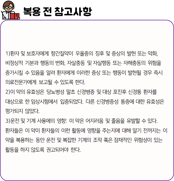 이 의약품은 "과도하게 흥분한 신경막을 안정시킴으로써 경련의 빈도를 감소시키고, 신경통을 개선하는 약"이니 참고하시길 바랍니다.