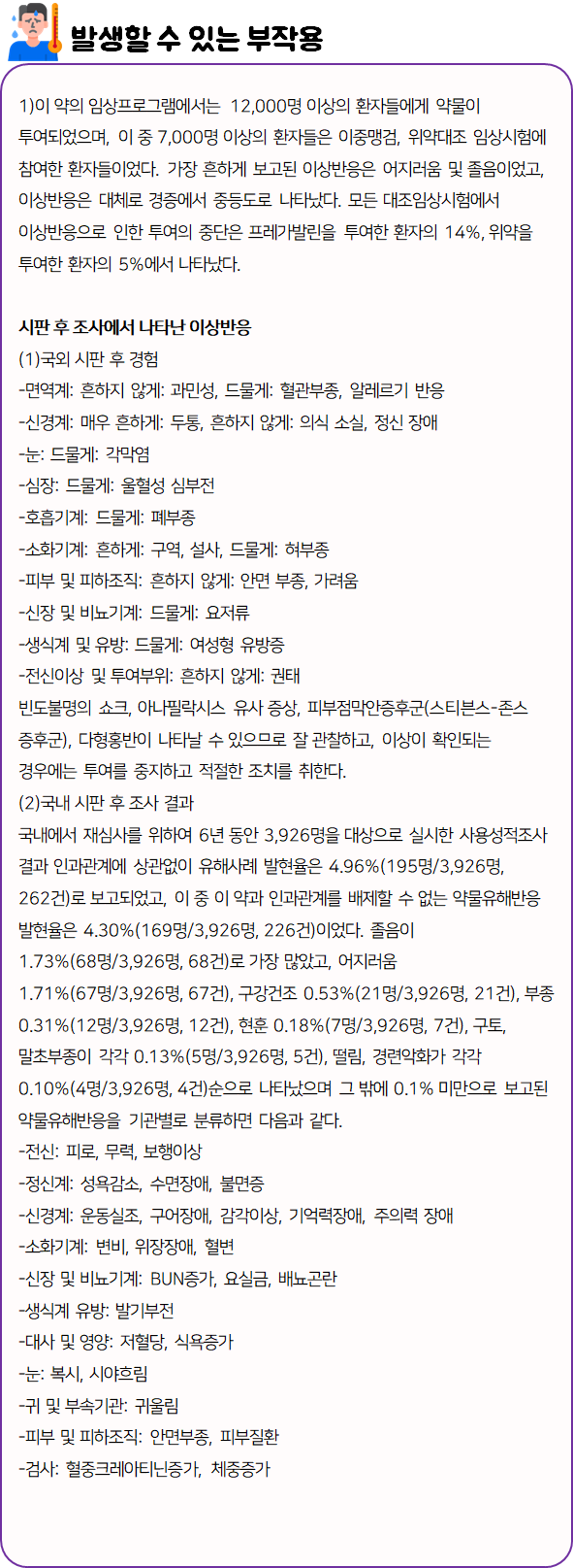 리리카캡슐75mg을(를) 복용할 시 다음과 같은 부작용이 발생할 수 있으니 주의하시길 바랍니다.