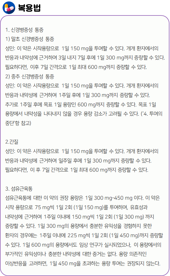 이 의약품은 "과도하게 흥분한 신경막을 안정시킴으로써 경련의 빈도를 감소시키고, 신경통을 개선하는 약"이니 참고하시길 바랍니다.
