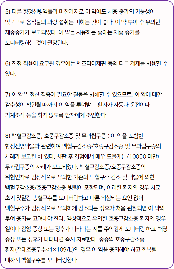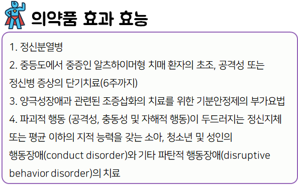 이 의약품은 환각 및 망상을 감소시키며 정신활동의 흥분상태를 제거함으로써 사회 적응을 도와주는 약이니 참고하시길 바랍니다.