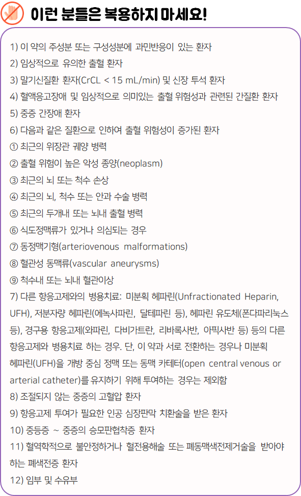 이 의약품은 혈액응고단백질 Xa를 직접적으로 억제하여 혈전 생성을 방지하는 약이니 참고하시길 바랍니다.
