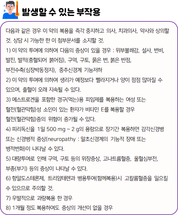 몸에 맞지 않는 의약품의 경우 크고 작은 이상 반응을 불러일으킬 수 있으므로 드시기 전에 반드시 부작용이나 주의사항 등을 미리 확인하시길 바랍니다.