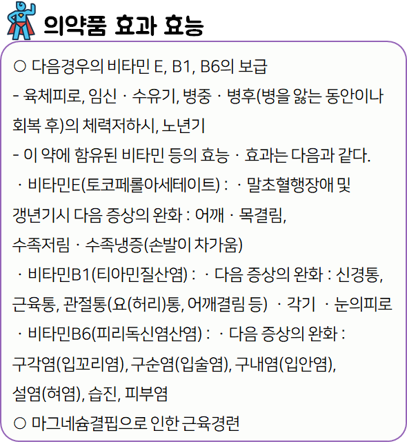 이 의약품은 '원활한 대사기능에 필요한 각종 영양분을 공급하는 근육 경련 및 혈액 순환 개선제'이니 참고하시길 바랍니다.