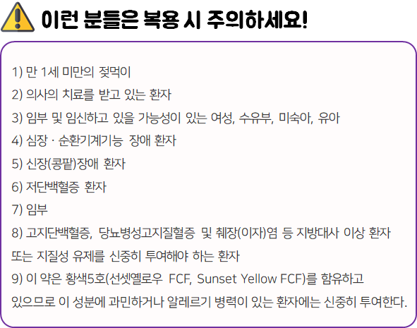 - 다음 환자는 복용 전 전문가 or 의사와 상담 후 복용하시길 바랍니다.