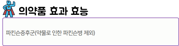 이 의약품은 부족한 도파민을 보충하여 파킨슨병의 서동, 강직 등의 증상을 완화시키는 약이니 참고하시길 바랍니다.