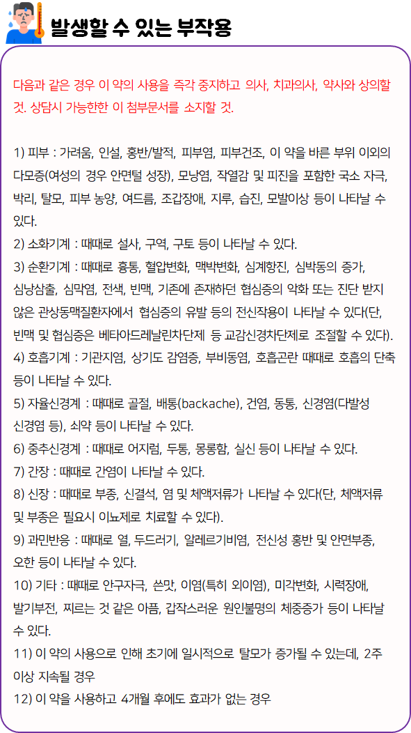 마이녹실을(를) 사용할 시 다음과 같은 부작용이 발생할 수 있으니 주의하시길 바랍니다.