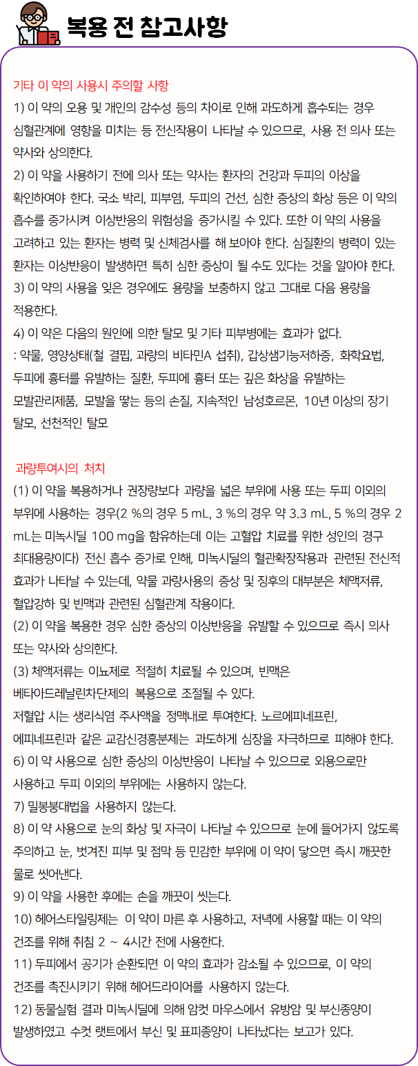 이 의약품은 혈관확장 작용으로 피부혈류를 증가시켜 모낭을 자극함으로써 발모를 촉진시켜주는 약이니 참고하시길 바랍니다.