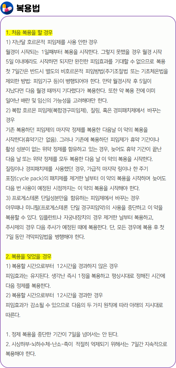 이 의약품은 배란을 억제하고, 자궁 경부를 변화시켜 정자의 침입을 막음으로써 피임 효과를 나타내는 약이니 참고하시길 바랍니다.