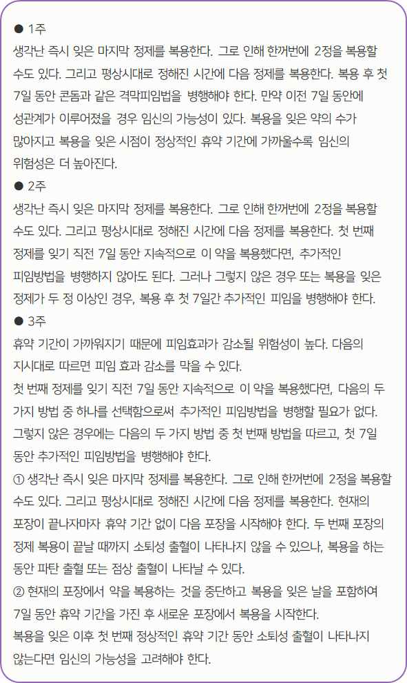 7일의 휴약기간 동안 월경이 나타나며 대개 정제의 마지막 복용 후 2~3일 내에 시작됩니다.