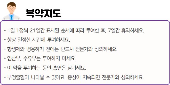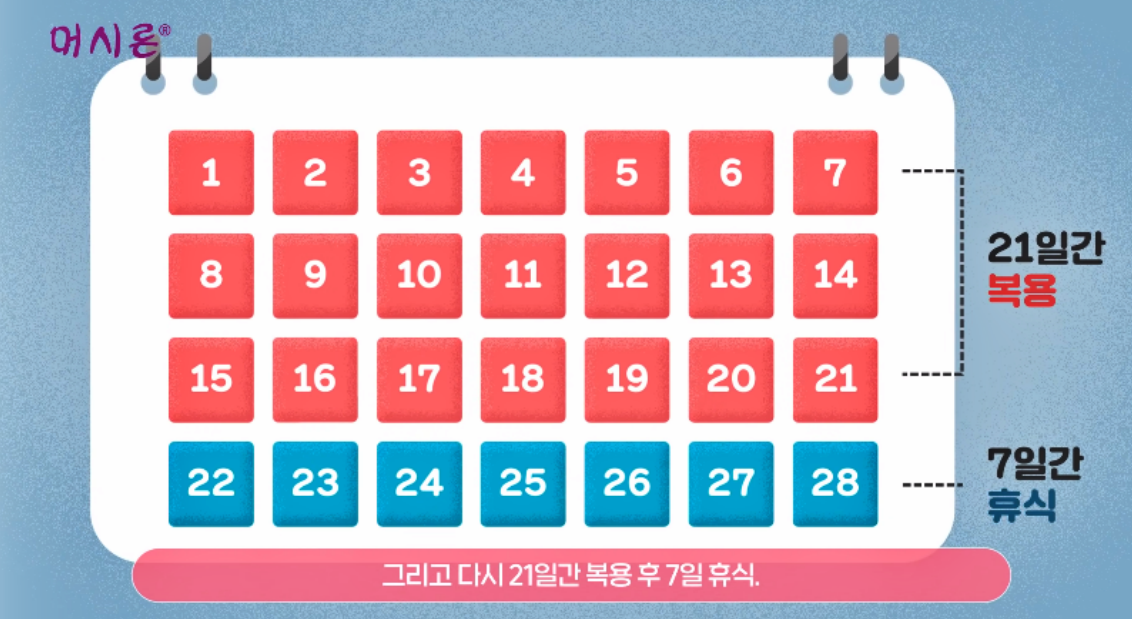그리고 다시 21일간 복용 후 7일 휴식, 이렇게 28일 간격으로 반복하면 됩니다.